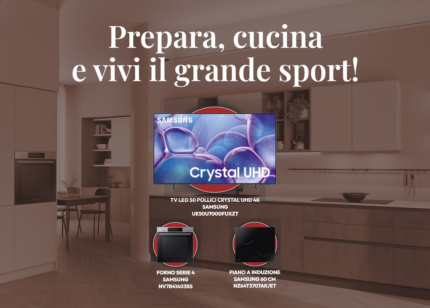 Acquista una cucina Scavolini del valore minimo di 6.000 € completa del Set Samsung (frigorifero e lavastoviglie) e il piano cottura Samsung NZ64T3707AK/ET, il forno Samsung NV7B41403BS e la TV Samsung UE50U7000FUXZT sono compresi nel prezzo*.